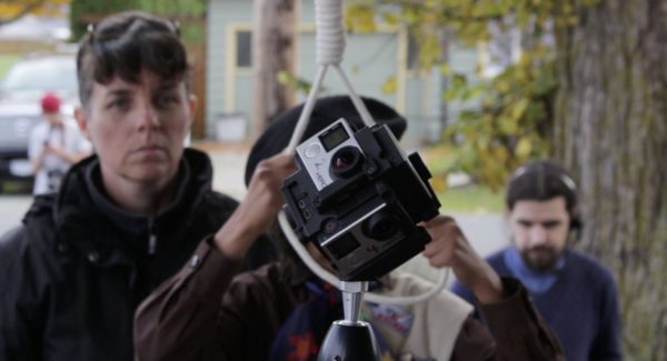(Left to right) Maureen Bradley, Aisha Haq, and Adrian Southin test their VR camera while