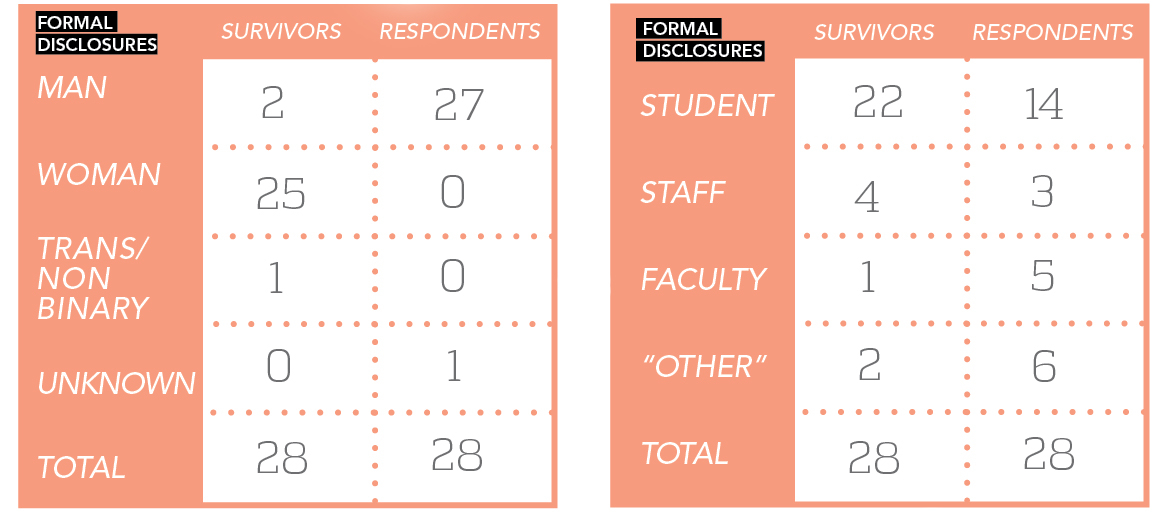 Under those conditions, 28 total formal disclosures were made by 22 students, four staff members, one faculty member, and two individuals listed as “others” by the official report — a classification that includes community members, alumni, and people whose identity is unknown. Of the alleged respondents in these disclosures, there were 14 students, three staff members, five faculty members, and six “others.”