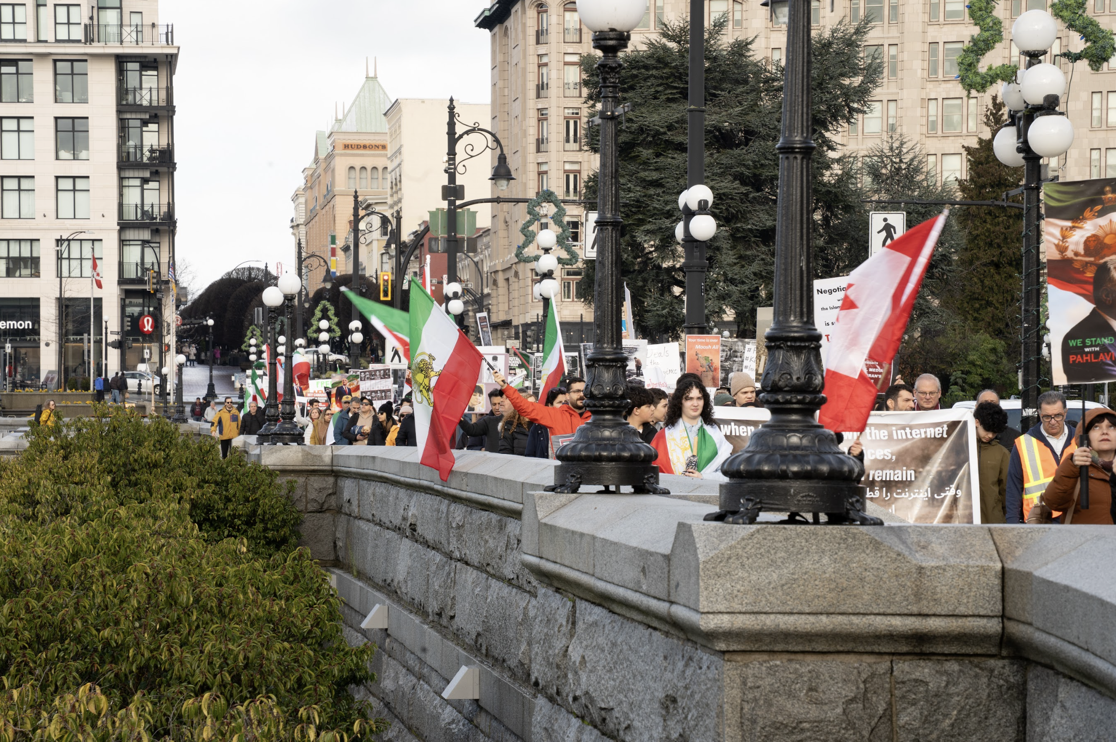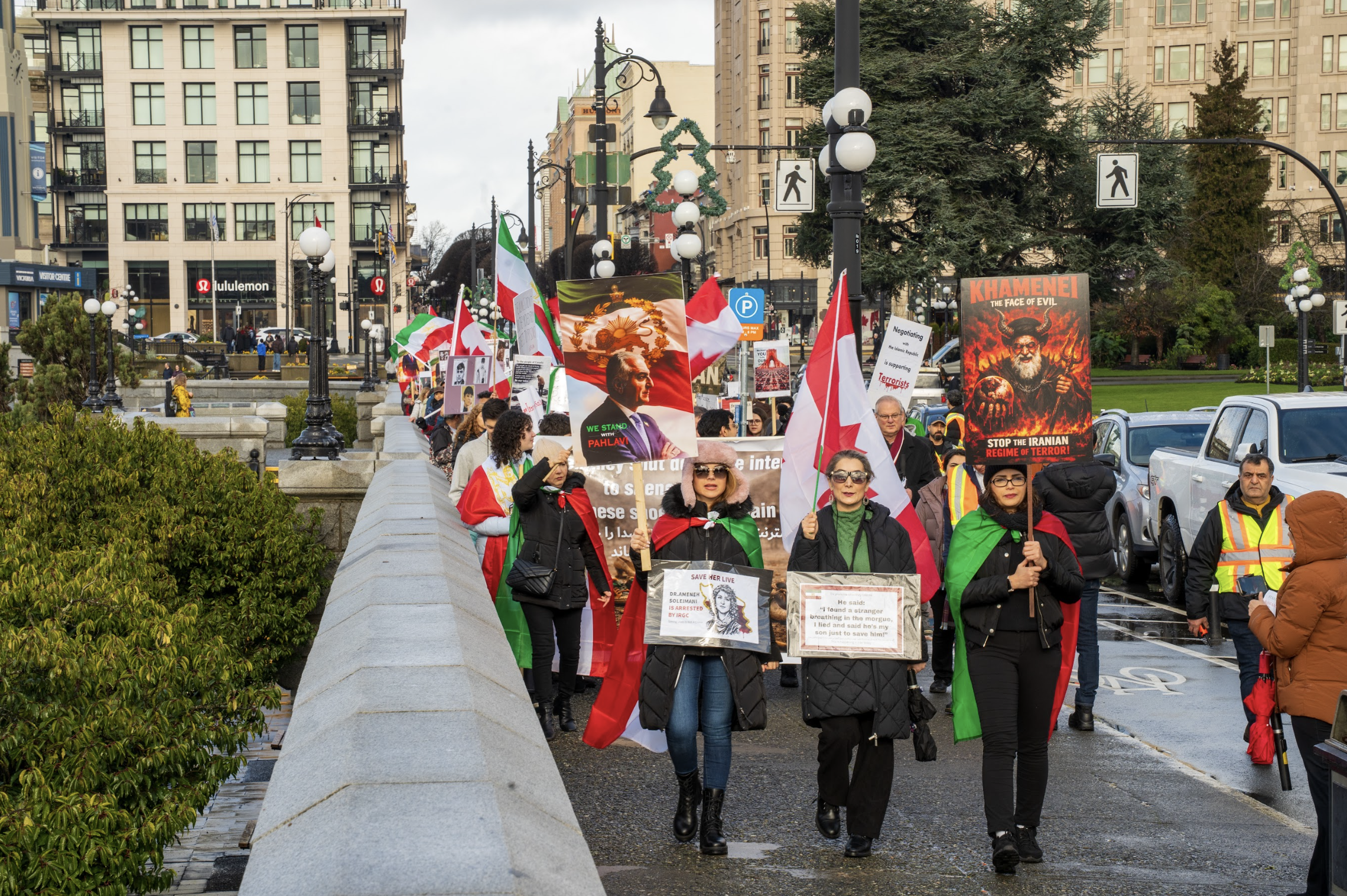 The march, which started at Centennial Square and ended at the B.C. legislature, saw attendees carrying both the Lion and Sun flag — an alternative Iranian flag, historically used by the country between 1907 and 1979, which is now used to show opposition to the Islamic Republic of Iran — and Canadian flags, as well as signs showing support for those protesting against the Iranian government.