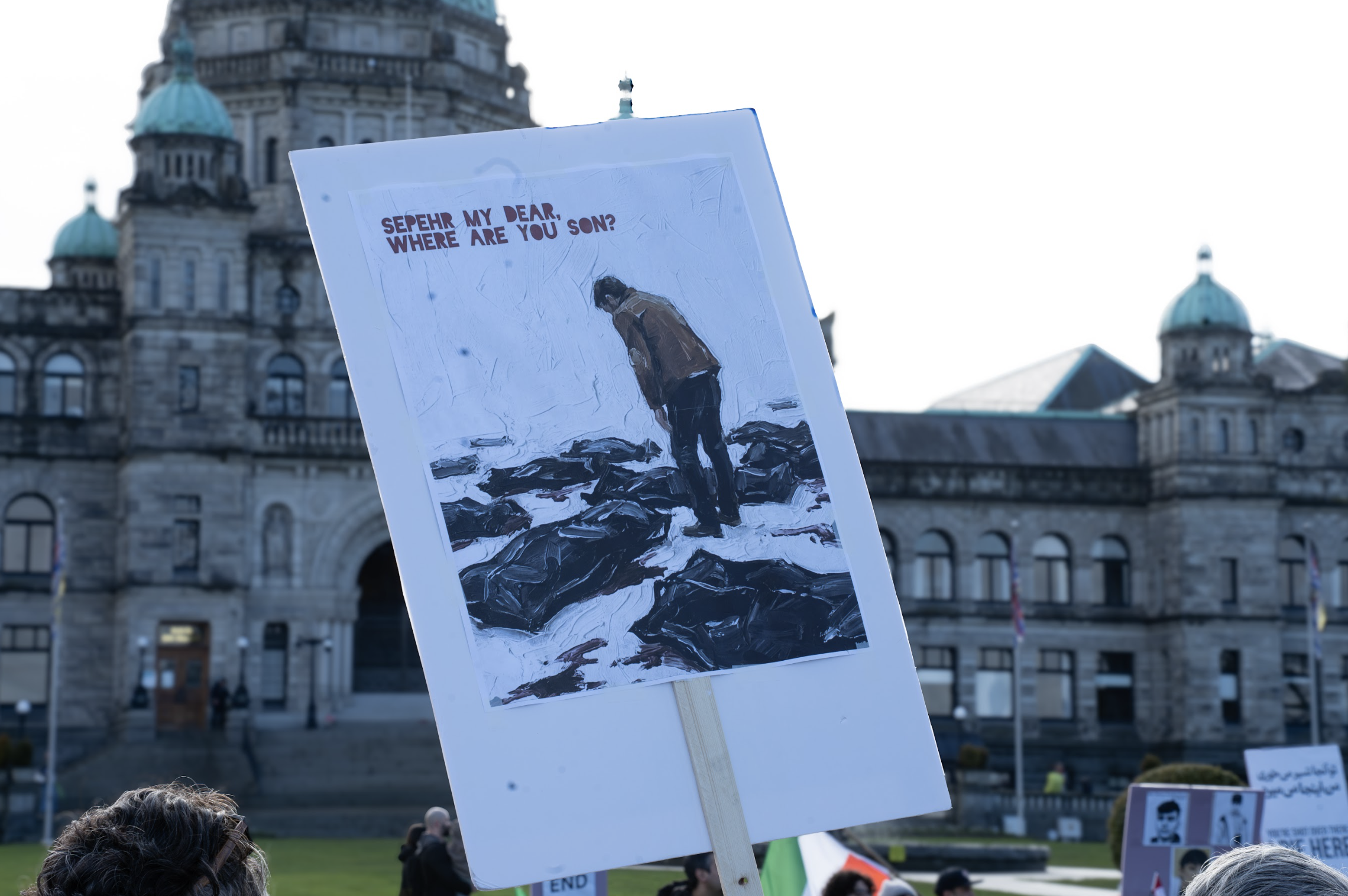 “Sepehr my dear, where are you my son?,” one sign at the march read, referencing a video of a father searching for his son’s body among some of the many killed during Iran’s protests.