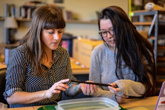 Alisha Gauvreau and Larissa Dixon prepare to take measurements of a worked wood artifact from the Triquet Island village site. The measurements will be used in Dixon’s independent class paper which Gauvreau will later reference for her PhD thesis. Photo provided