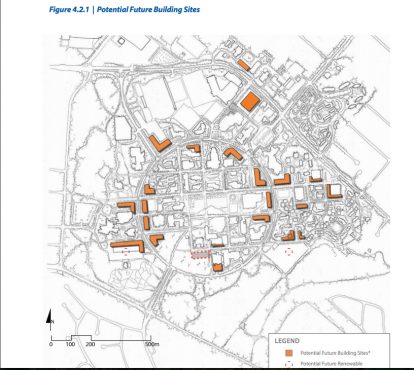 A map of the potential building sites for UVic’s new residence building, announced on Sept 11. Photo via UVic Campus Plan