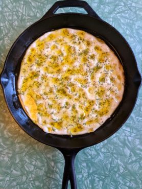 Set your oven to 175 degrees Celsius (350 Fahrenheit if you’re a fucking Yankee and pronounce it like “Z” instead of “Z”) and grab your dough and something to cook it in. I use a cast iron pan because it cooks evenly but honestly any sort of oven safe dish with a lip will do. Your dough will rise a bit, so it’s totally possible that the oil will overflow if the lip of the dish is too short. Which is bad, by the way.
