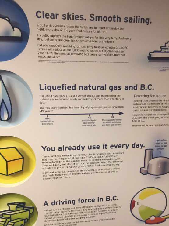The sign said things in big, soft likeable letters, like that Liquified Natural Gas (LNG) is “leaving us with a cleaner, brighter future” … “You already use it everyday” … “LNG is just a way of storing and transporting the natural gas we’ve used safely and reliably for more than a century in B.C.” … “[It’s] like shrinking a beach ball down to a ping pong ball” … “Clear skies, smooth sailing” … “Natural gas is a cleaner and more affordable fuel for B.C.’s growing transportation industry.”