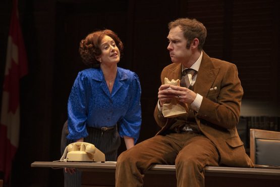 Throughout the play, political context is projected onto the wall of the Prime Minister’s office, featuring details like Clark’s gas tax, the 1979 approval rating of Clark’s successor, Pierre Trudeau, and the number of projected votes for and against the budget. The projector serves as a way to keep the audience up to speed. It becomes a character in its own right, and the actors break the fourth wall at times to react to its updates.