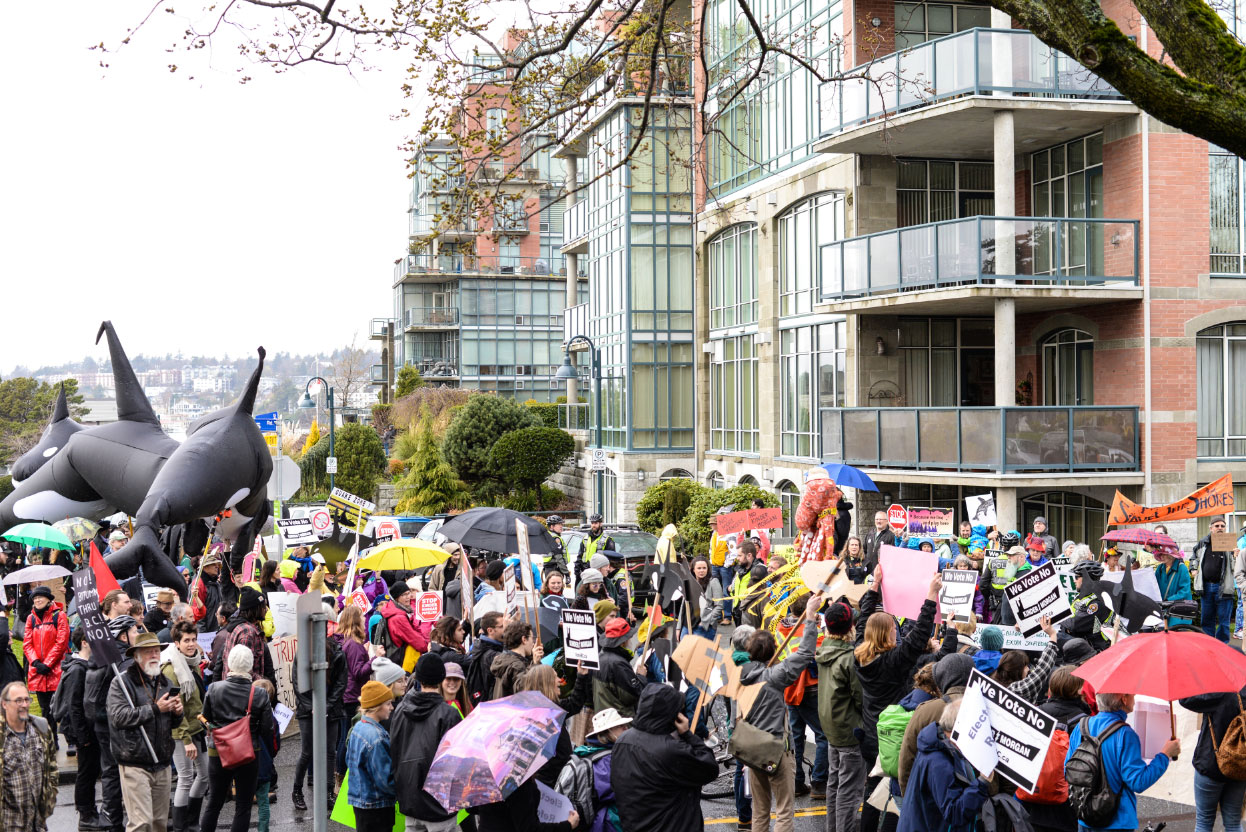 Coste had heard about the Prime Minister’s unadvertised visit by accident during a CBC interview 20 hours earlier, and he quickly set to work mobilizing Victoria citizens to attend the rally, protesting in part the risks posed by the Trans Mountain Pipeline Expansion Project approved by Trudeau that will increase oil tanker traffic through the Salish Sea by 700 per cent.