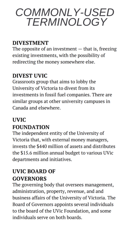 Divest UVic is a group that aims to lobby the university, and specifically the UVic Foundation (the independent group charged with managing and investing the university’s $440 million in assets), into freezing any further investments in fossil fuel companies and redirecting all existing investments in fossil fuel companies over the next three years.