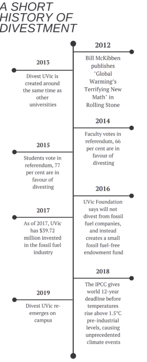 CORRECTION: In the print version of this article, pertaining to the graphic “A short history of divestment,” under the subheading “2016,” the Martlet wrote that UVic established a fossil fuel endowment fund. This was supposed to say UVic established a fossil fuel-free endowment fund. We deeply regret the error, and will be issuing a written correction in our next issue on Feb. 21.