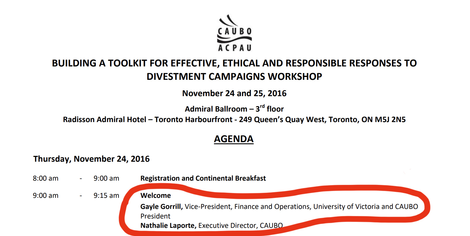 Although Coward couldn’t speak to the 2016 workshop, (only mentioning that UVic hosted a balanced forum on the subject of divestment in 2015), the workshop’s agenda shows that Gayle Gorrill, UVic’s Vice-President of Finance and Operations and the Foundation’s President — who also happened to be the CAUBO President at the time, and now serves on its board of directors — gave both the welcoming and concluding remarks at the event.