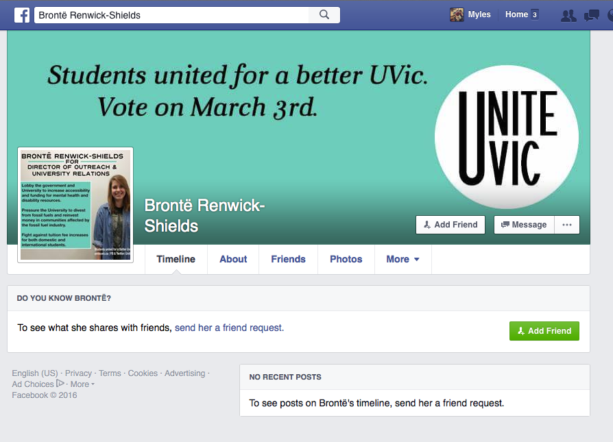 The Martlet has discovered that two Facebook accounts currently exist in Brontë Renwick-Shields’ name — the second of which still has a Unite UVic profile picture and cover photo (pictured, referred to henceforth as “Renwick-Shields”).