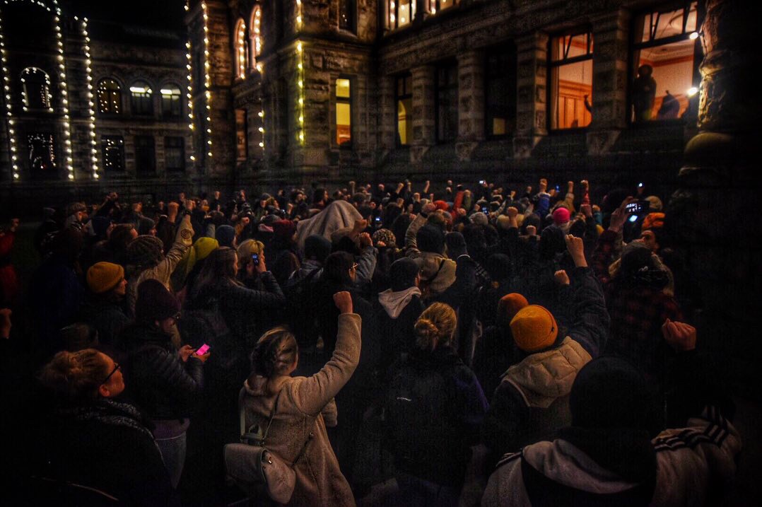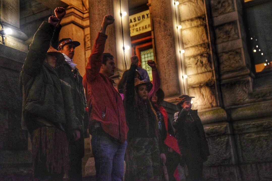 Earlier that night, Fraser agreed to meet with seven Indigenous youth inside the Legislature following a request earlier that day by the demonstrators to meet with a minister from the government to demand the removal of Coastal GasLink and the RCMP from Wet’suwet’en territory. The Indigenous Youth for Wet’suwet’en have been sleeping on the legislature steps for 16 days.
