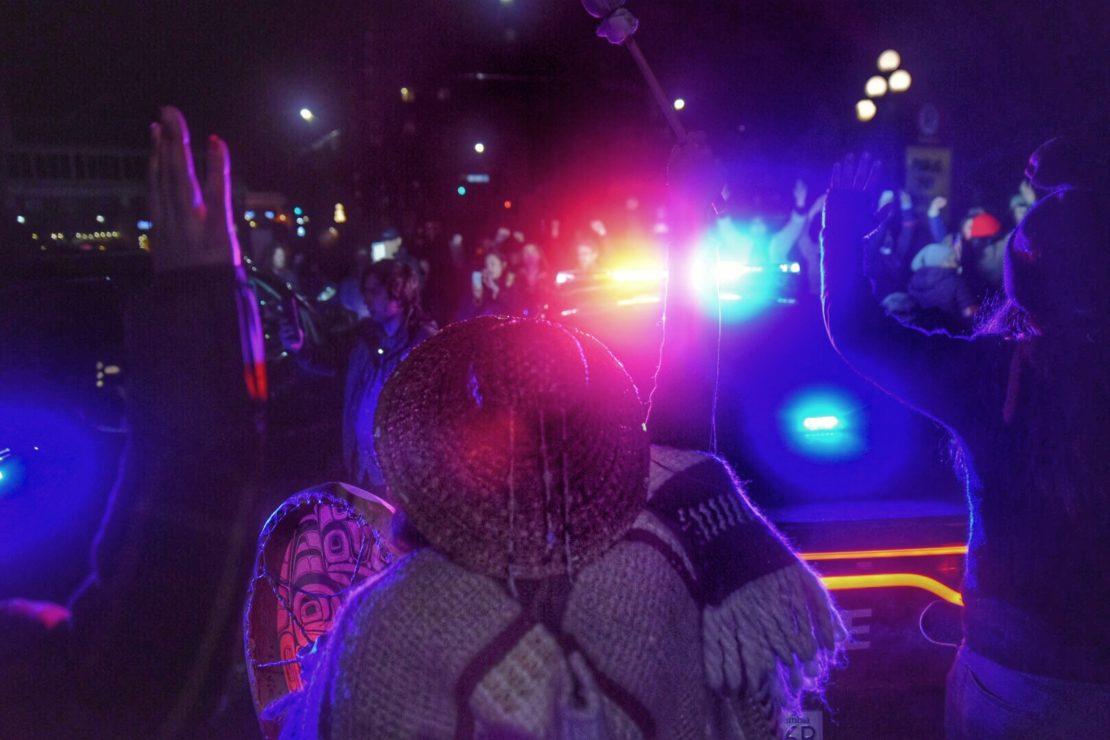 At the same time, Victoria Police and Legislative Security were readying an entrance on the west side of the legislature building to transport the Indigenous youth outside into waiting police vans. Four of the arrested demonstrators were carried into the vehicles, and one walked. The path was lined by a crowd, but videos from the scene do not show any interference with police.