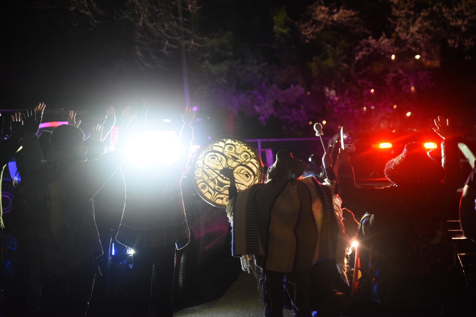 After this, a group surrounded two police vehicles present and blockaded a police van. Members of the Victoria Police shone their lights brightly and put on their sirens while Indigenous youth drummed and yelled things like “we keep us safe” and “this is what reconciliation looks like” at the police. The scene was extremely tense and confrontational, as the crowd filmed with their phones and repeatedly asked the police information about their badges and what they were doing.