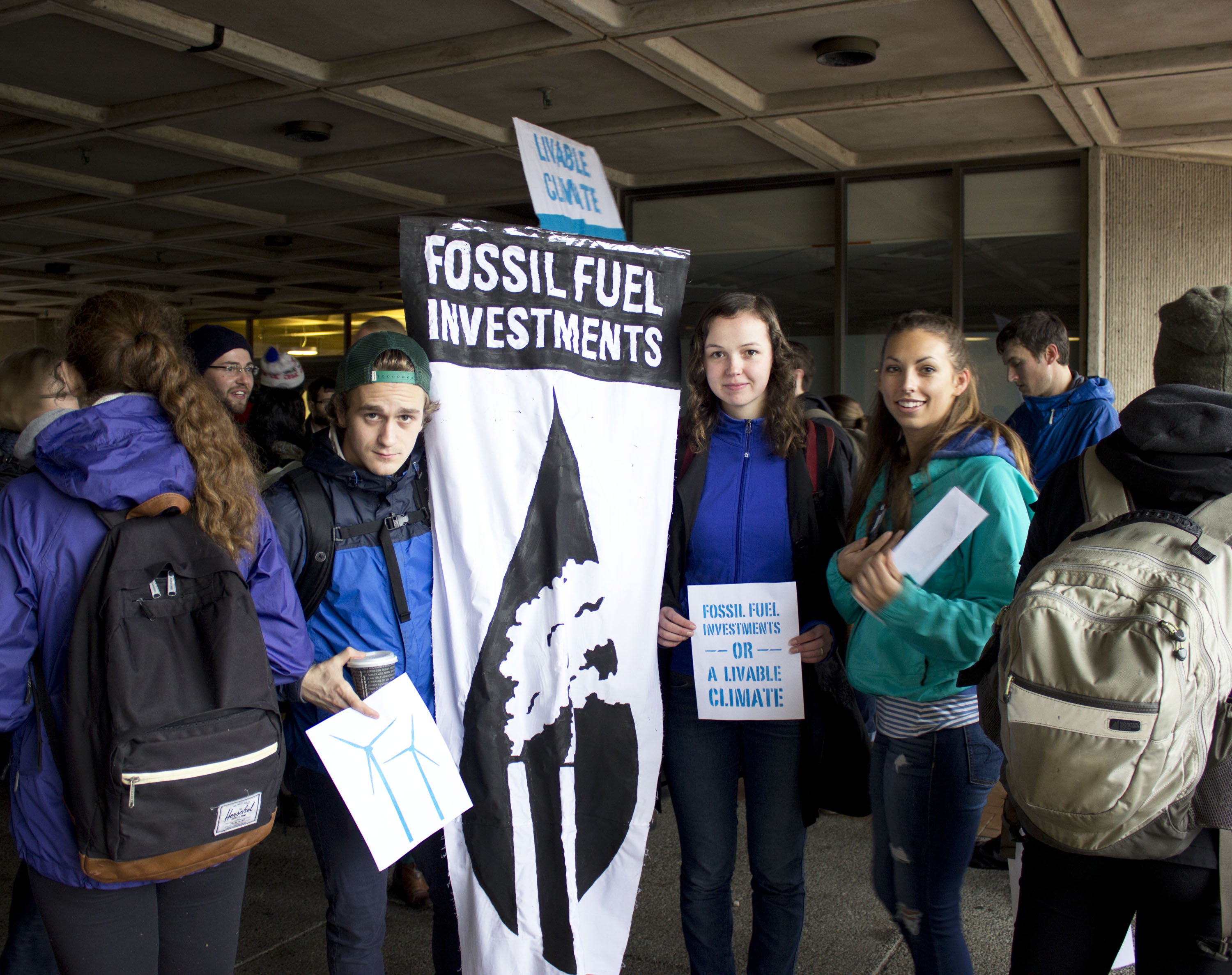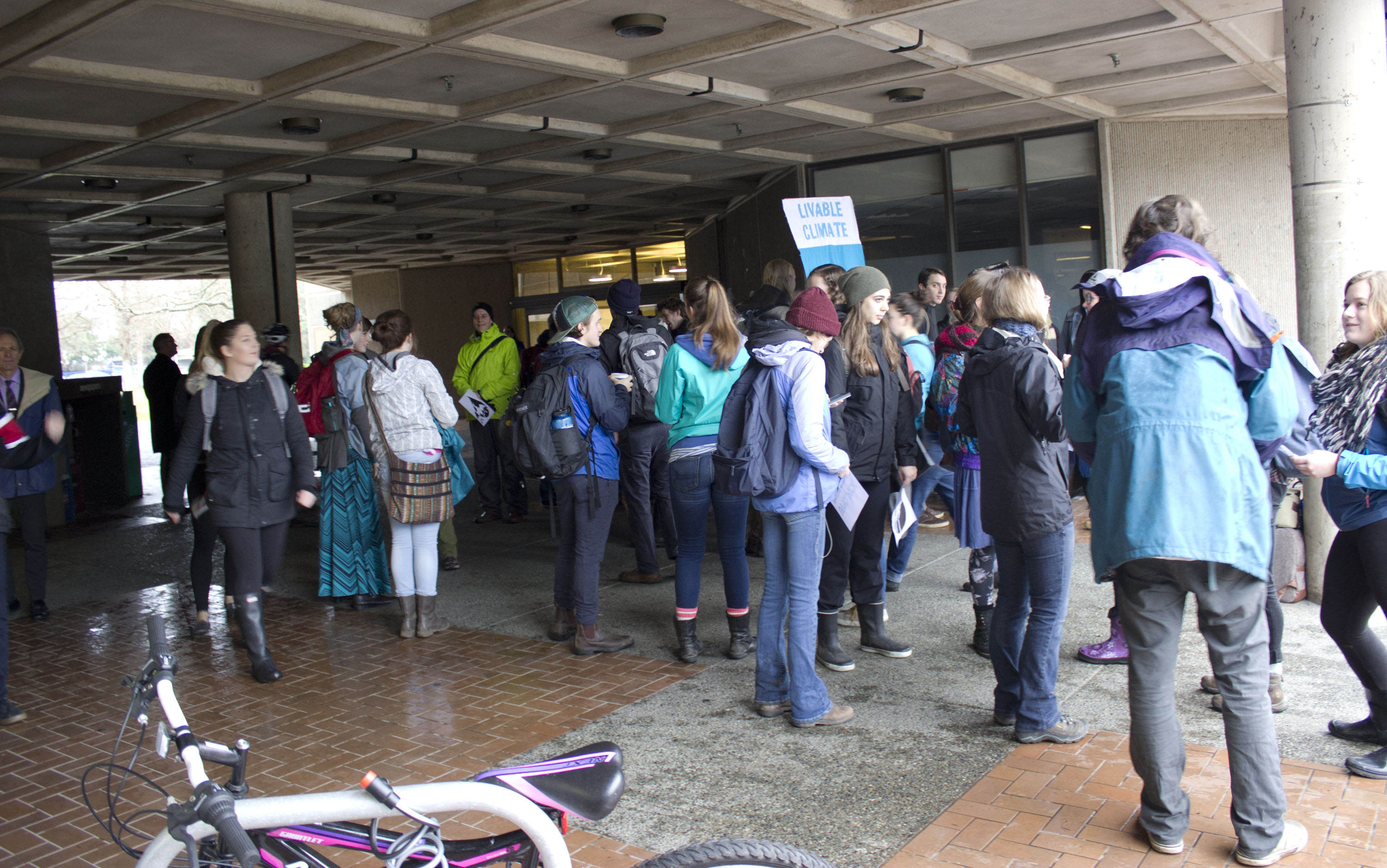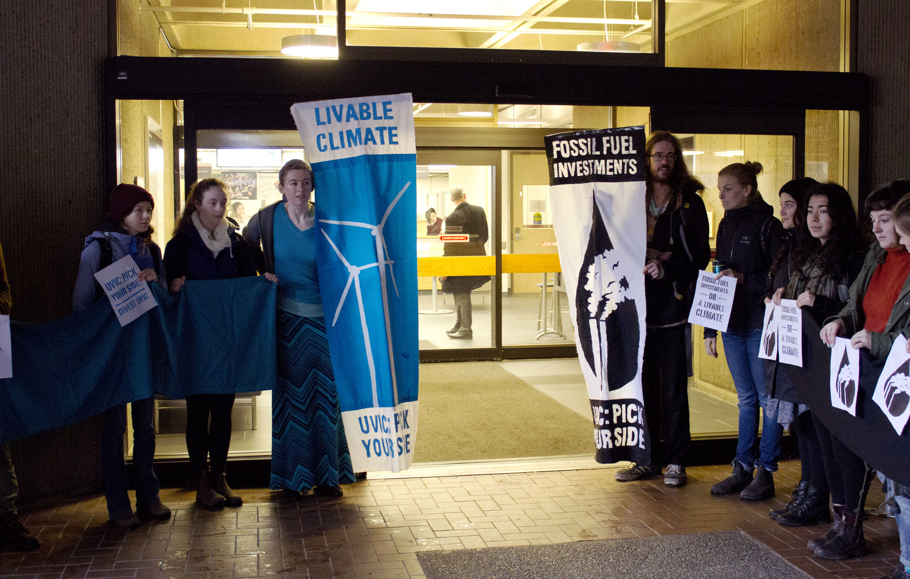The demonstrators responded in the wake of a letter from UVic Faculty for Divestment that was received Dec. 14, 2015, and scheduled first on the docket for consideration by the Board. The letter has over 200 signatures, and calls upon the university “to freeze new [fossil fuel] investments now, and phase out current investments over the next three years.”