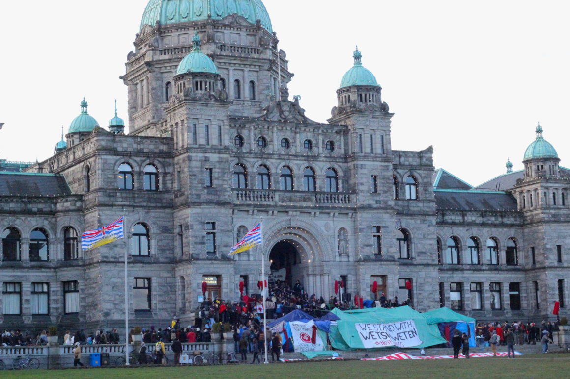 For the first time in B.C.’s history, the B.C. Legislature’s throne speech ceremony was cancelled, due to an occupation in solidarity with the Wet’suwet’en people on the front steps that has been ongoing since Feb. 6. Indigenous land defenders and allies staged soft blockades outside all 16 entrances to the building, and at the entrances of the nearby Douglas Building and legislative bunker.