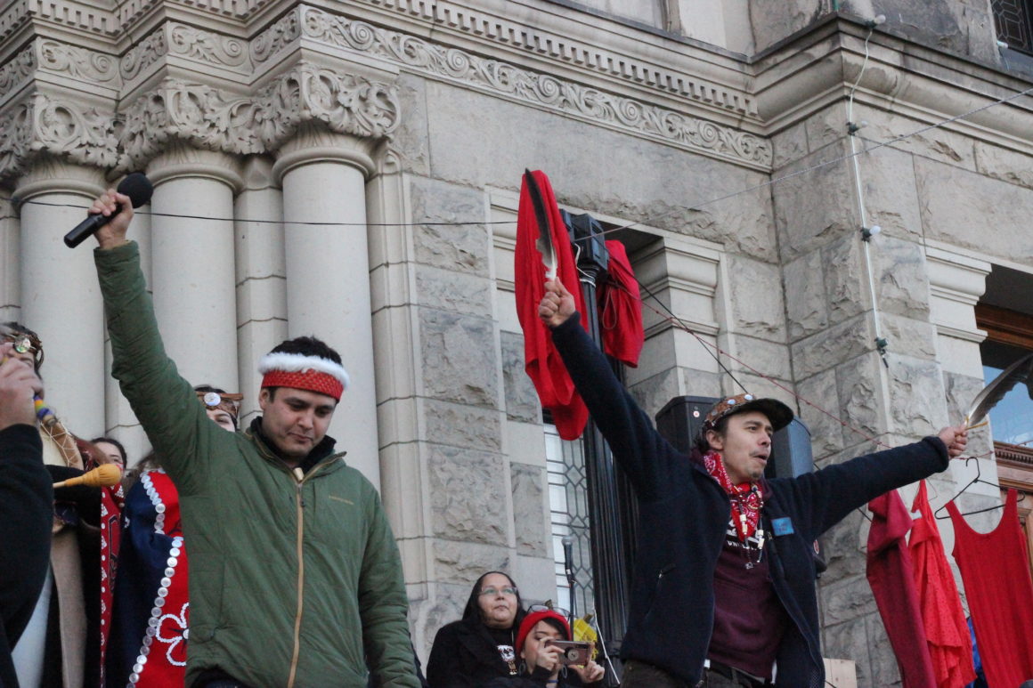 About 1000 people stand in solidarity with Wet’suwet’en hereditary chiefs at doors to B.C. Legislature and neighbouring government buildings