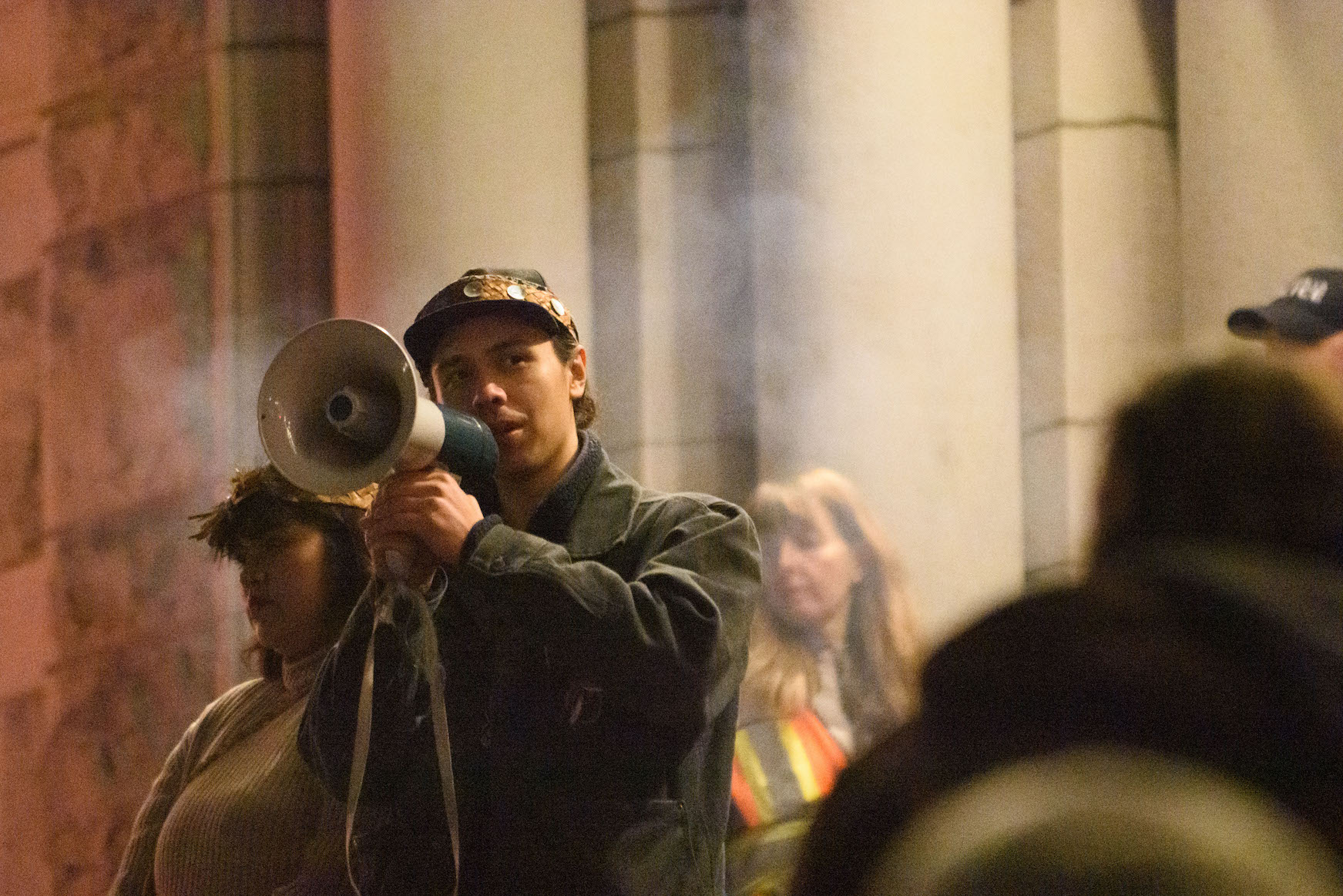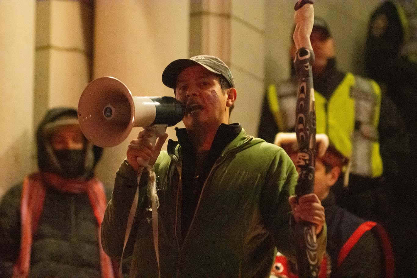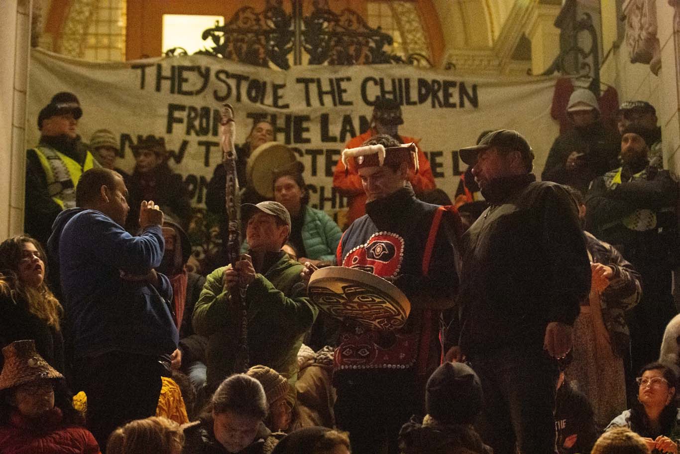 Throughout the night, Indigenous leaders spoke to the hundreds of gathered Indigenous youth and allies with messages of support and updates on arrests of three Gitxsan hereditary chiefs and other supporters at a CN Rail blockade. Ricochet reported six arrests were made as of 10:00 p.m. that night.