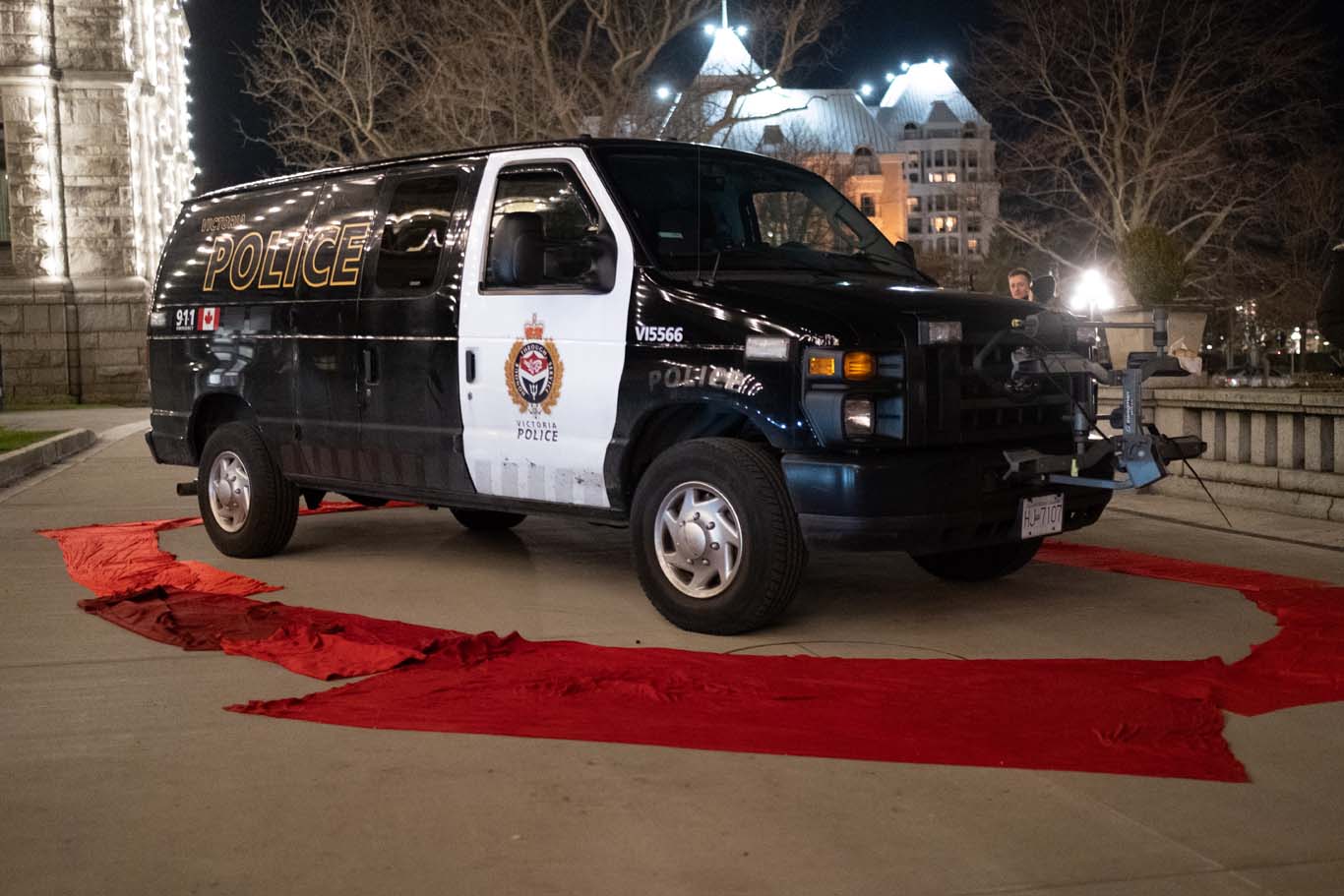 Shortly after the Indigenous youth and allies began to gather at 3:00 p.m., a van from the Victoria Police Department arrived at the legislature and attempted to pull around the front, but stopped in front of a soft blockade.