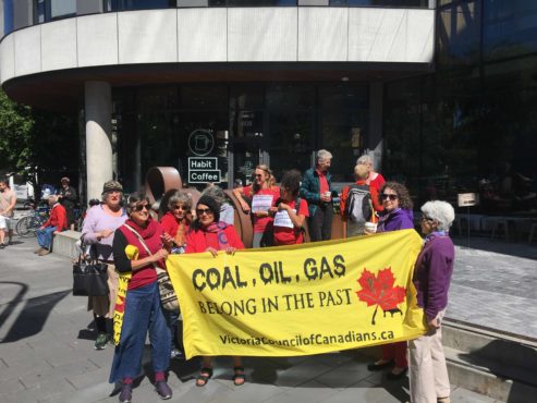 About 200 protesters wearing red clothes gathered outside the Atrium in downtown Victoria to rally against the federal government’s recent decision to purchase the Trans Mountain pipeline from Kinder Morgan.