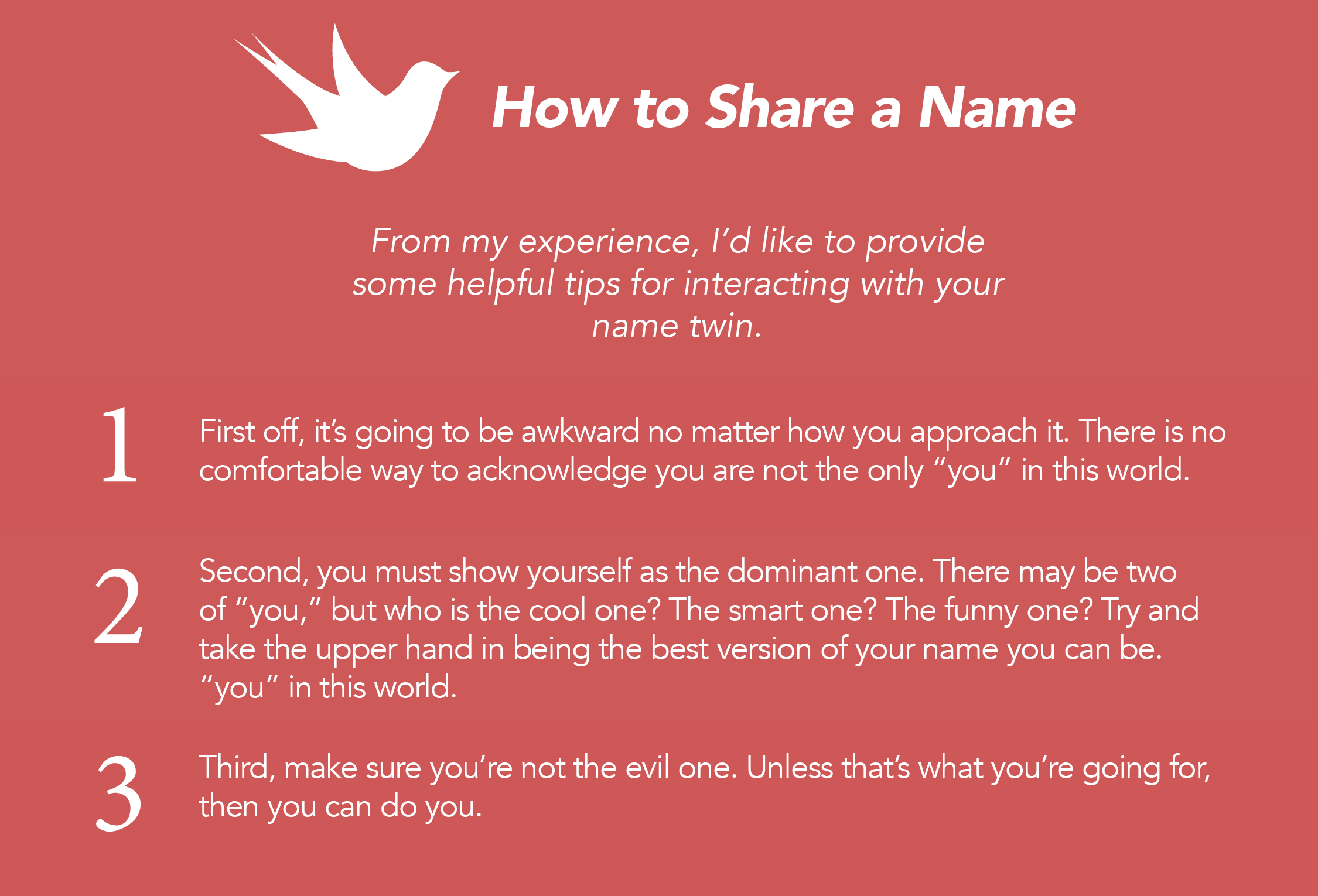 Being the only person by one name in the world would be cool, but I have the advantage of blaming things on the other Sarah Mayer’s in existence. That stupid Vine? It wasn’t me, I swear.