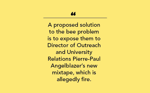 A proposed solution to the bee problem is to expose them to Director of Outreach and Community Relations Pierre-Paul Angelblazer’s new mixtape, which is allegedly fire.
