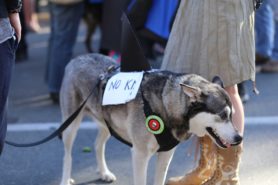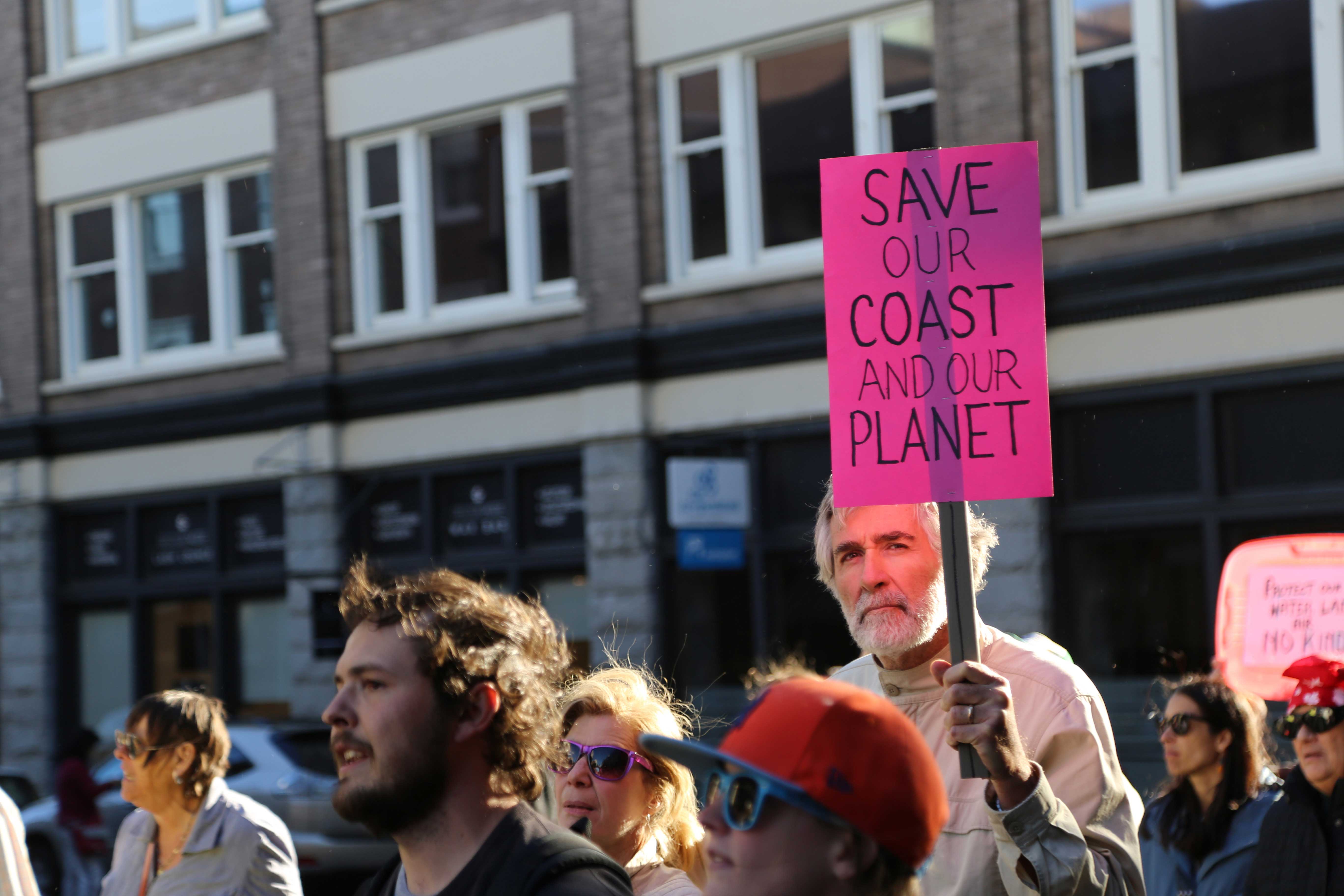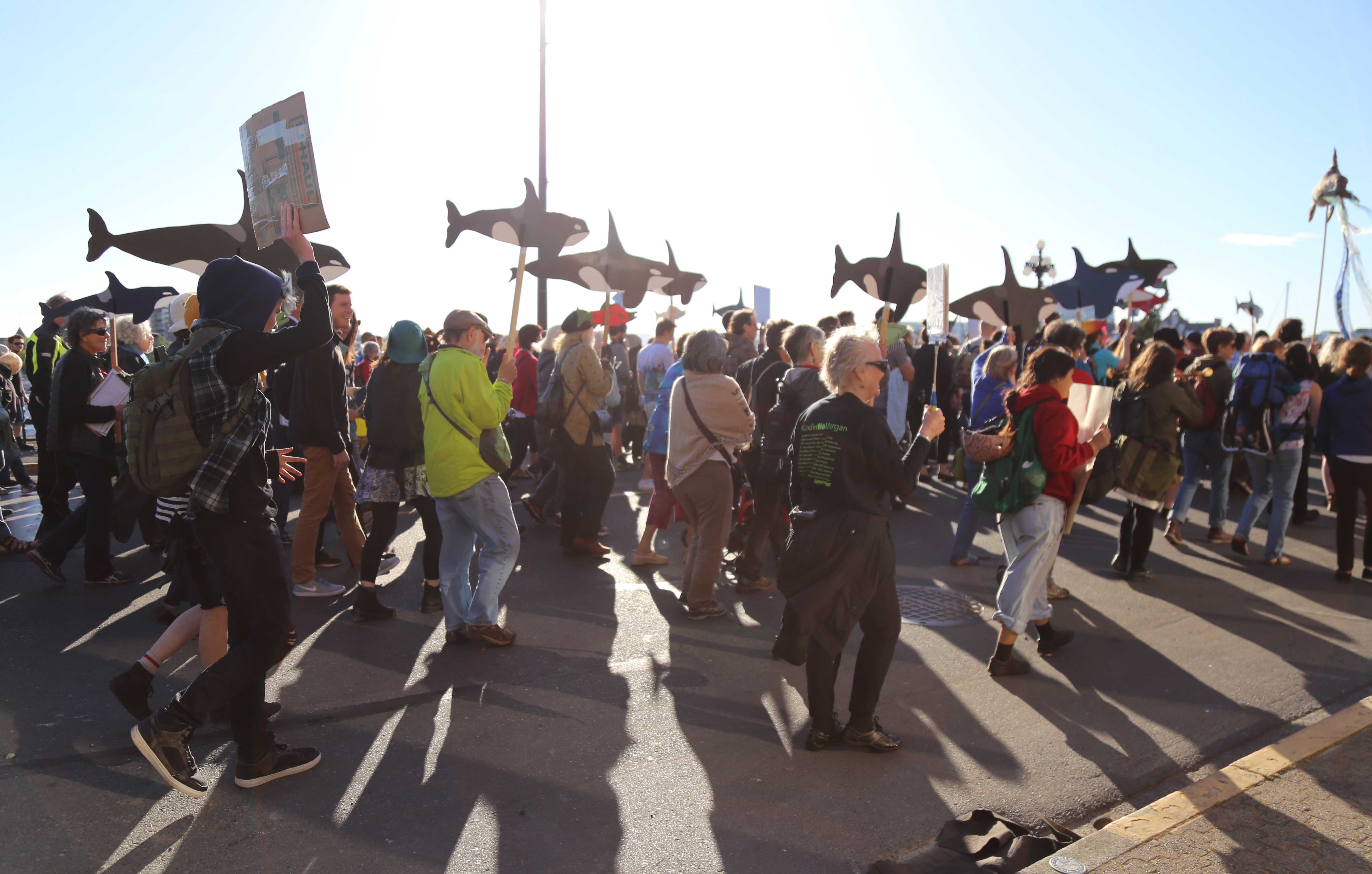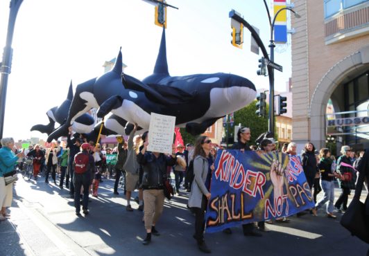 There was certainly no sense of resignation among the crowd, who walked the blustery downtown streets with signs, giant inflatable orcas, guitars, and drums. The procession stopped several times, once at Douglas and Fort and yet again at Douglas and Yates, to dance and chant.
