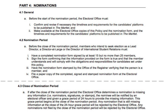 The complaint also cited UVSS Electoral Policy section 5.1 A as a reason for disqualification. The section says candidates must show up to meetings scheduled by the Chief Electoral Officer, and was allegedly breached when Ricard failed to show up to an official Elections Office meeting on time.