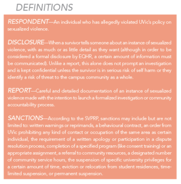 According to section 10 of UVic’s SVPRP, anyone impacted by sexualized violence is entitled to receive all information about the options and processes available to them upon disclosure. However, adherence to this section of the policy has been inconsistent across campus since the policy’s implementation.