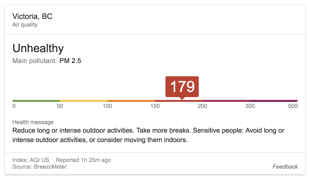 Victoria’s air quality, as of Aug. 22. The readings are more in line with cities like Mumbai and Shanghai. Data via BreezoMeter and Google
