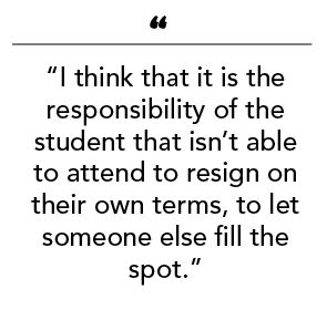 Citing Witt’s comments, Curtis Whittla, a newly elected student senator who will begin representing the faculty of Social Sciences in the fall, said that he believes the duty must fall on the student. “I think that it is the responsibility of the student that isn’t able to attend to resign on their own terms, to let someone else fill the spot.”