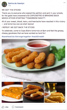 The triumphant Facebook post announcing the return of the mozza sticks. Screenshot via Facebook