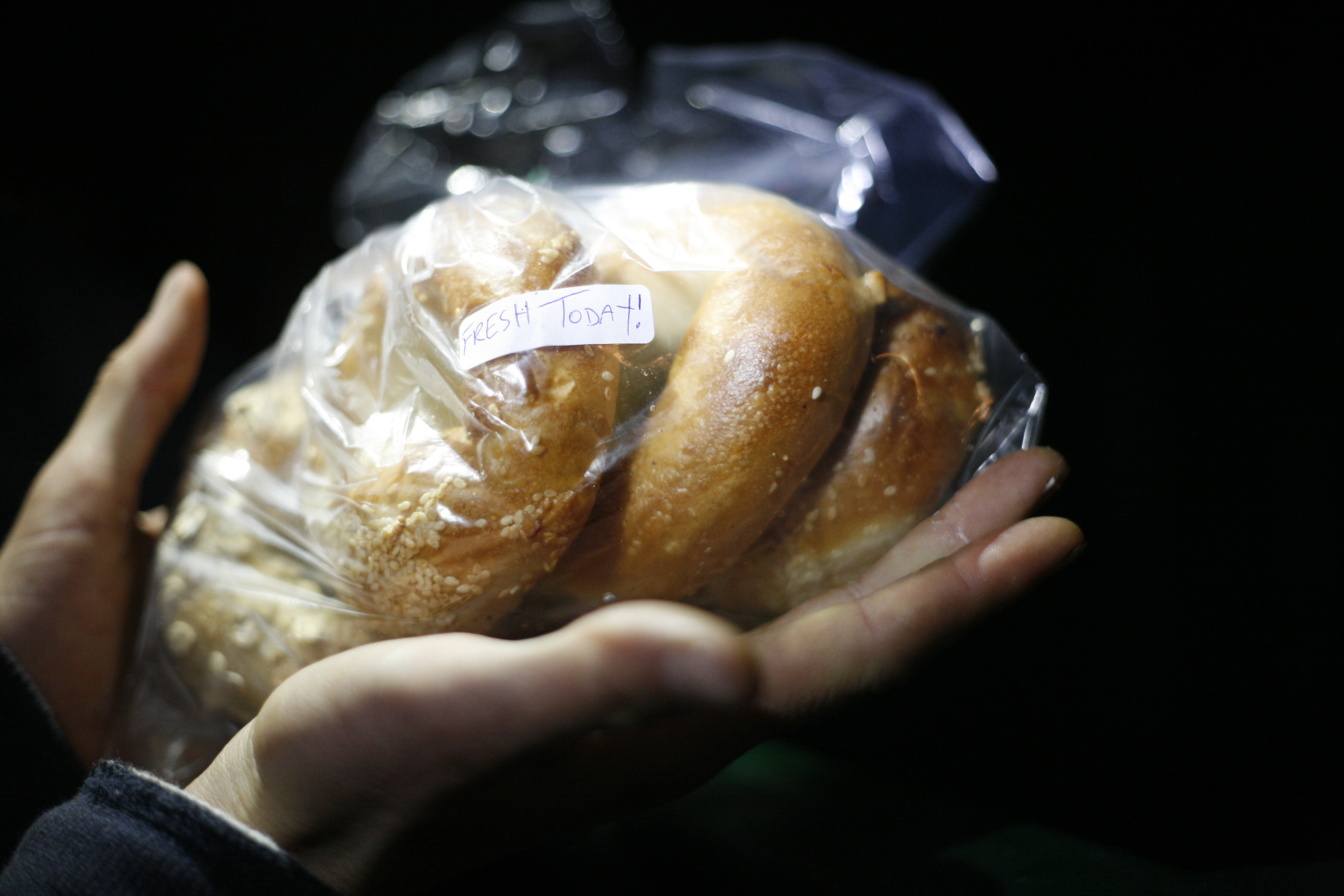 At the bagel store, the pickings were slim, but we managed to fill a small bag with assorted flavours. Again, there was little wrong with the goods beyond their day-oldness.