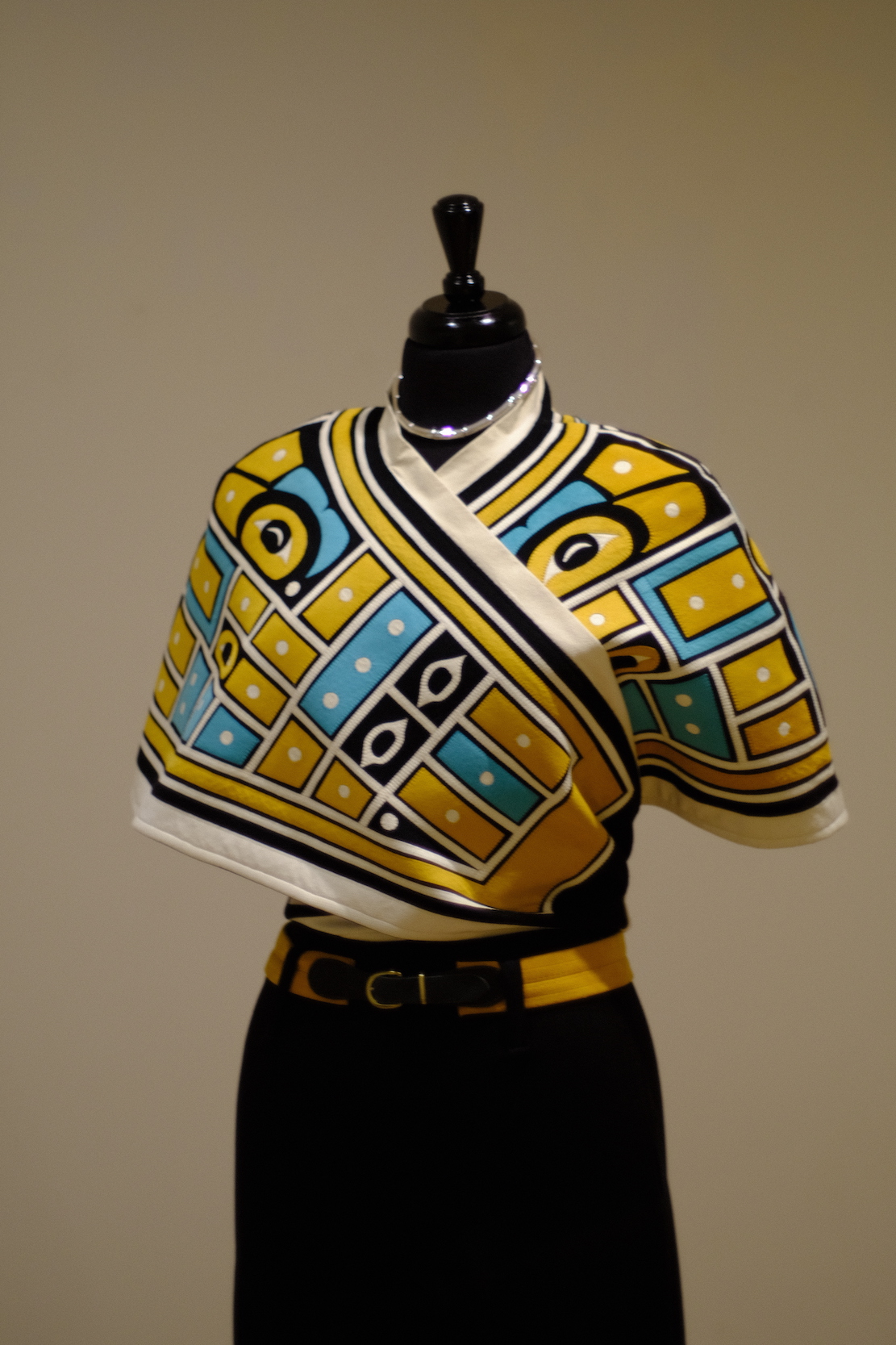 All of the top pieces on the mannequins have a classic wrap style, with intricate Indigenous designs. The pieces of clothing are all colour-coordinated, and did not have a vast array of colour, other than one of the outerwear pieces on one mannequin. This particular piece is named the Rainbow Warrior shawl. The mannequin wearing it has on a yellow turtleneck dress under the colourful shawl, and the yellow colour was well-coordinated to the yellow design apparent on the outerwear. Most of the mannequins have bold necklaces that match the outfits, but do not take attention away from the pieces of clothing. In simple words, I would describe the pieces as a collaboration of Indigenous culture and vintage Hollywood.