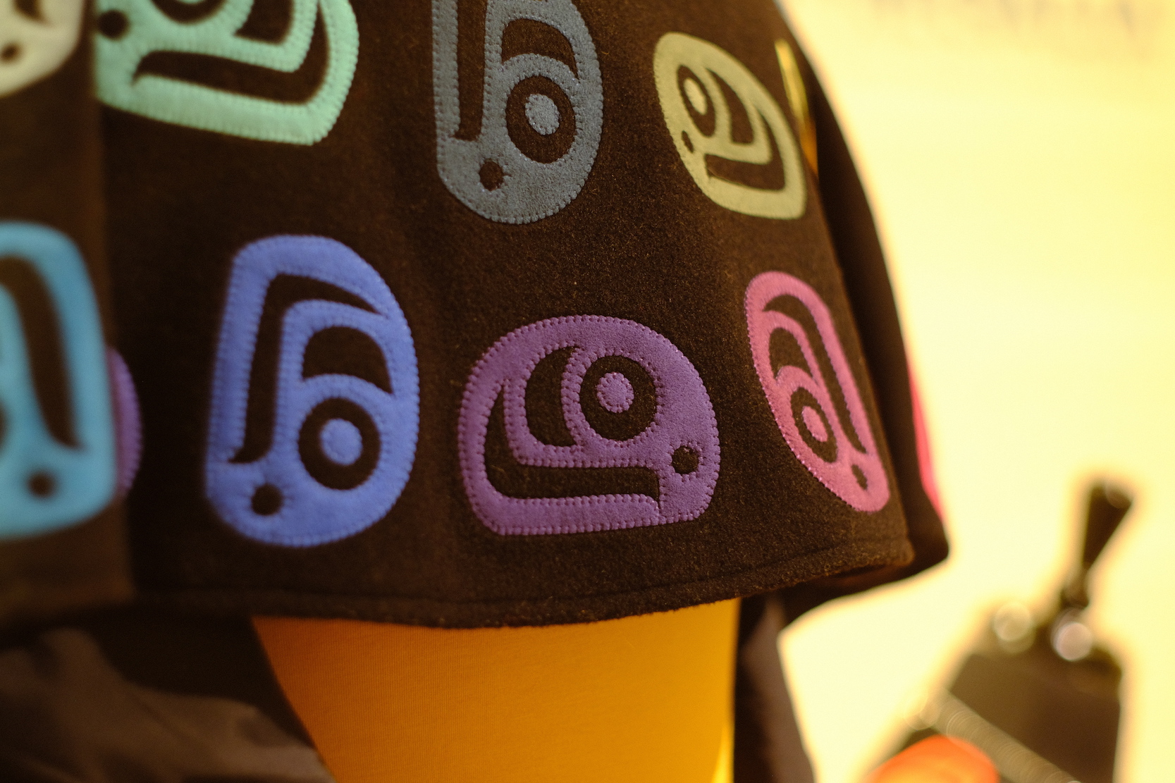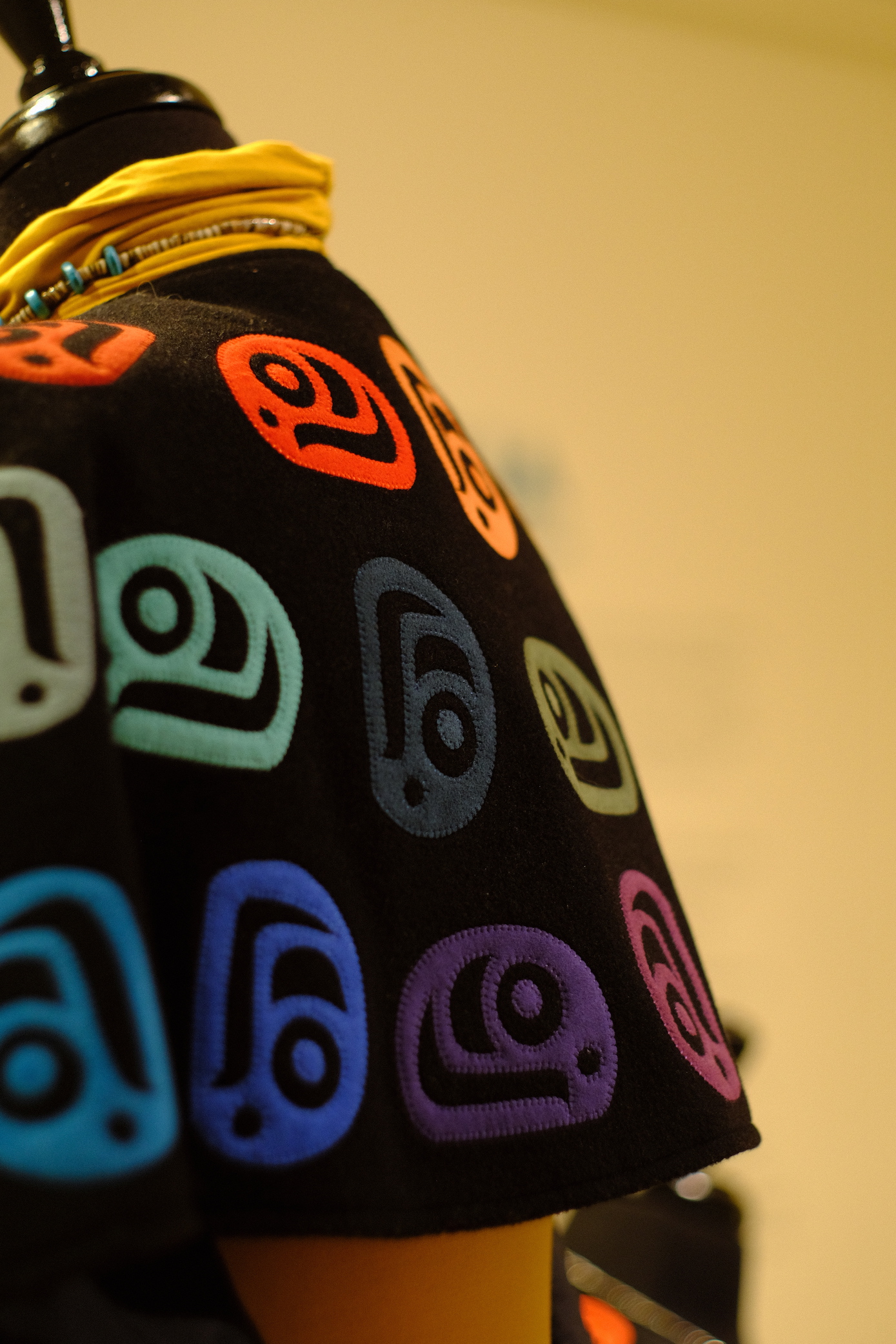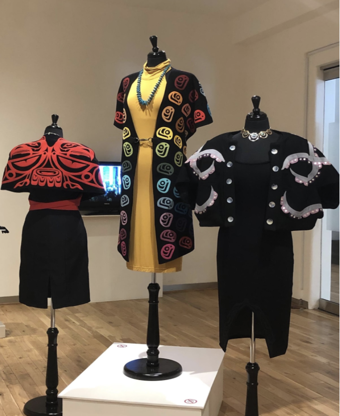 There were seven mannequins, each wearing a piece designed by Gitxsan textile artist and fashion designer, Sug-ii-t Lukxs (Yolonda Skelton). The looks were inspired by her late grandmother, Na-gwa (Lily Jackson), and the traditional tales she told Skelton. Along with the historic inspiration from her grandmother, there is an apparent Hollywood style to the designs.