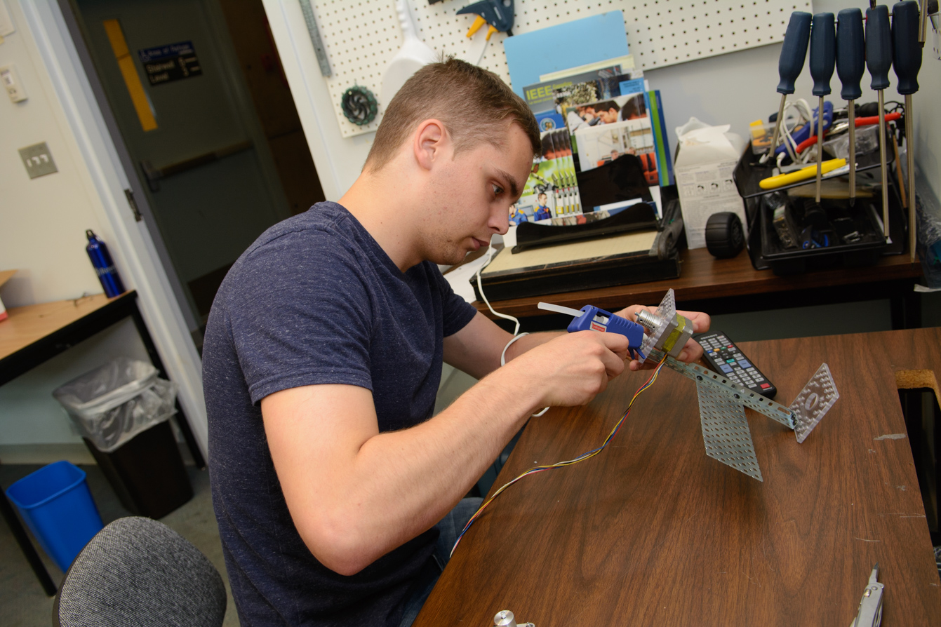 - Michael Funk is part of a three-person team building a wheeled robot that follows a line of electrical tape on the ground autonomously. A sensor on the robot discerns its path by measuring reflected IR light. (Photo by Hugo Wong)