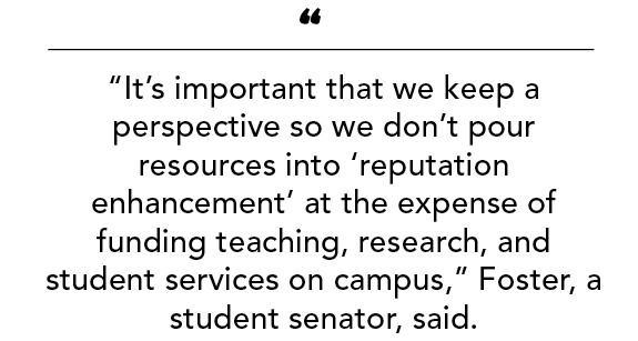 “It’s important that we keep a perspective so we don’t pour resources into ‘reputation enhancement’ at the expense of funding teaching, research, and student services on campus,” said Foster.