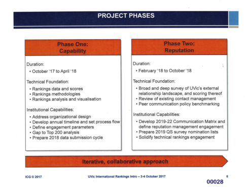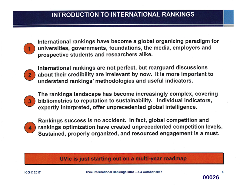 In a presentation from ICG shown to UVic administrators in October 2017, the firm said that international rankings influence eligibility for scholarships and international research collaboration, mould employer perspectives, and determine the quality of students and researchers at a university.
