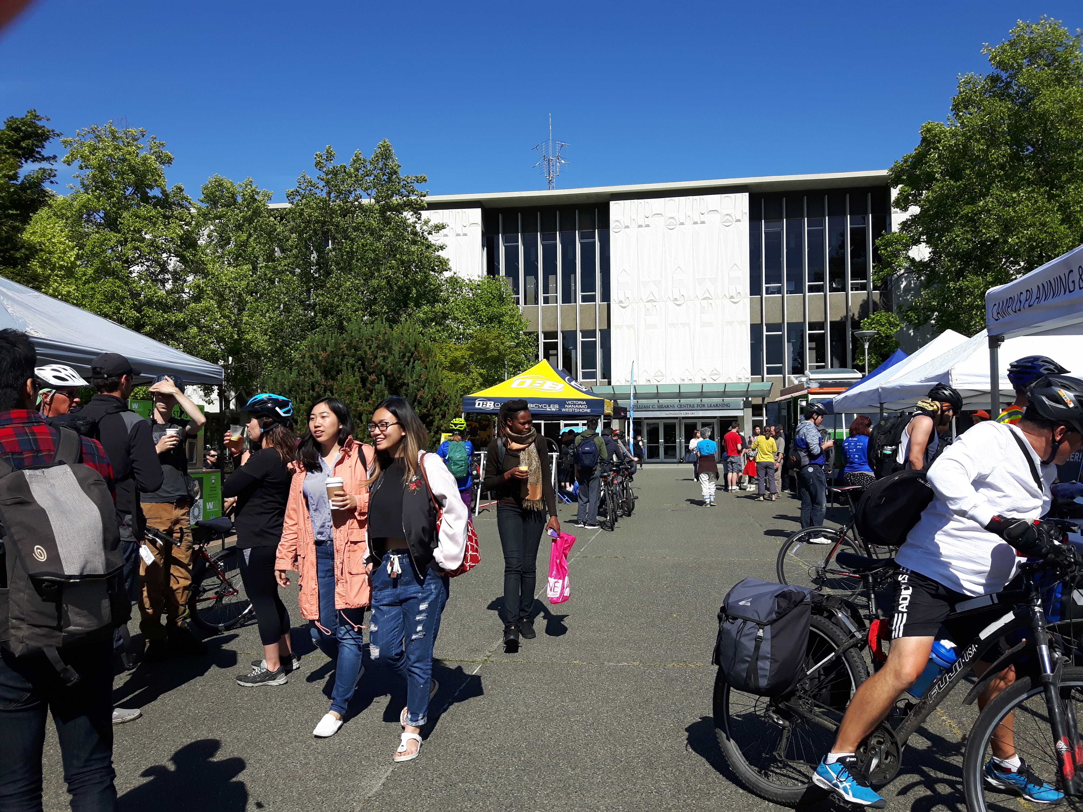 Students mill about at booths set up for Bike to Work Week. Photo via UVic Campus Planning and Sustainability