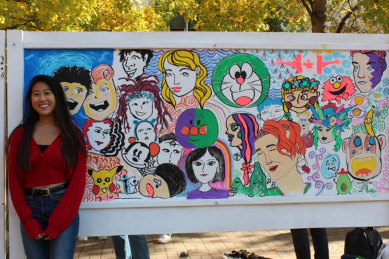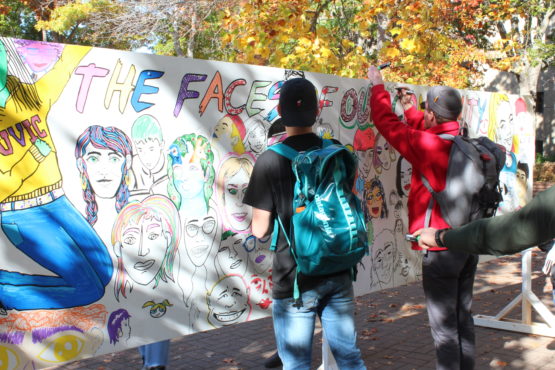 The ‘Faces of our Community’ mural workshop, led by Art Education student Kira Chong, was designed initially to help integrate international students into the campus community, but quickly turned into a event where all students on campus gathered to alleviate stress with the swipe of a paintbrush.
