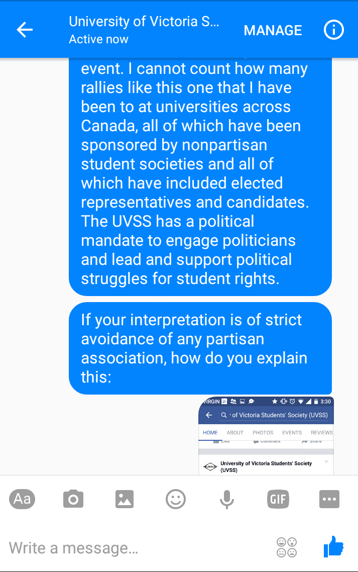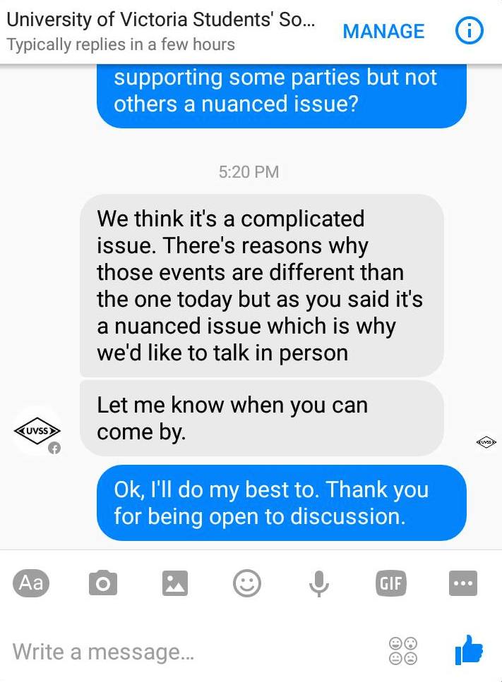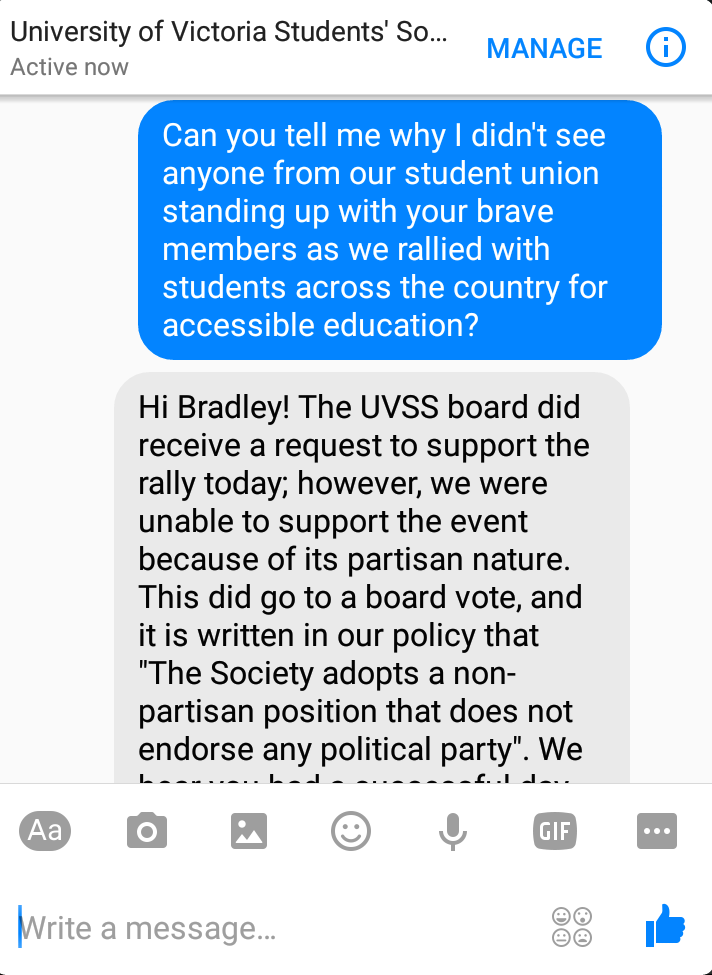 Later that day, UVic teaching assistant Bradley Clements forwarded screenshots to the Martlet of a conversation that took place via private message with the UVSS Facebook page. The screenshots show Clements asking the UVSS why no student union representatives were present alongside its “brave members” at the rally.