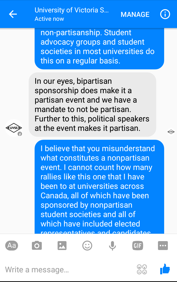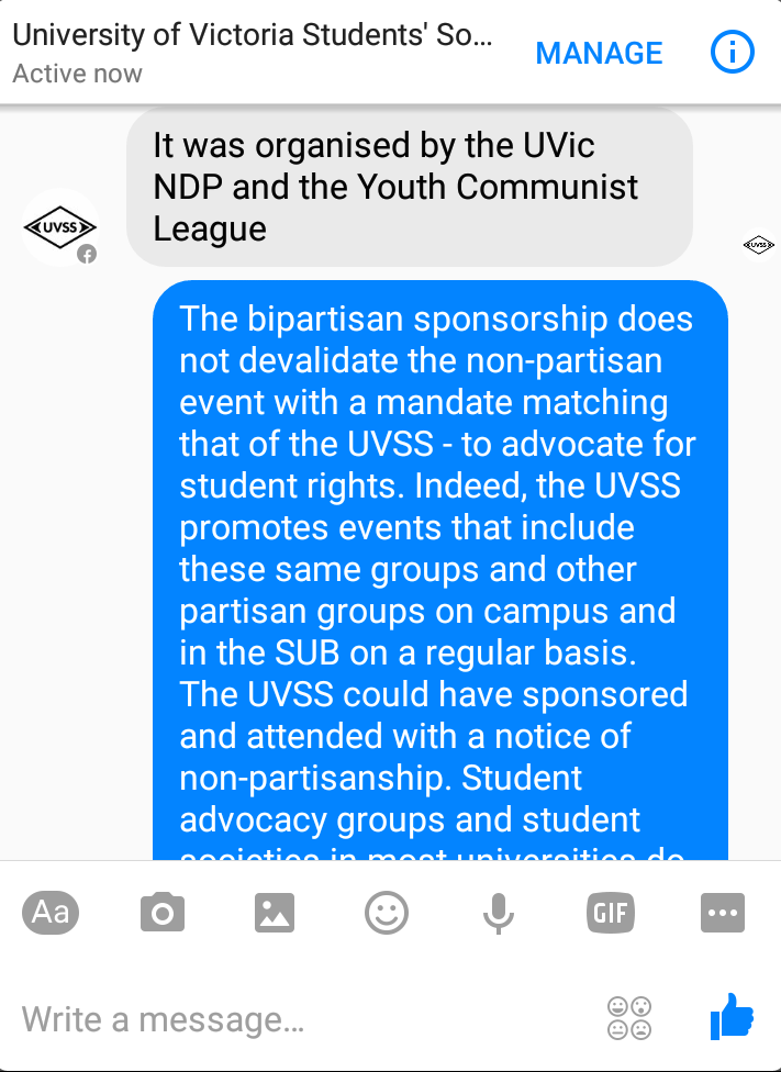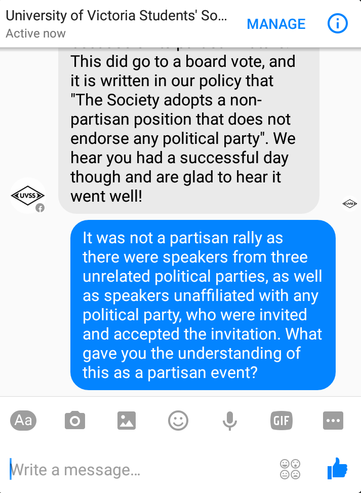 An anonymous UVSS staff member, who the Martlet confirmed was UVSS interim director of outreach and university relations Alysha Flipse, responds by reiterating that “we were unable to support the event because of its partisan nature,” and goes on to quote UVSS Board of Directors policy 2.3, which reads: “The Society adopts a non-partisan position that does not endorse any political party.”
