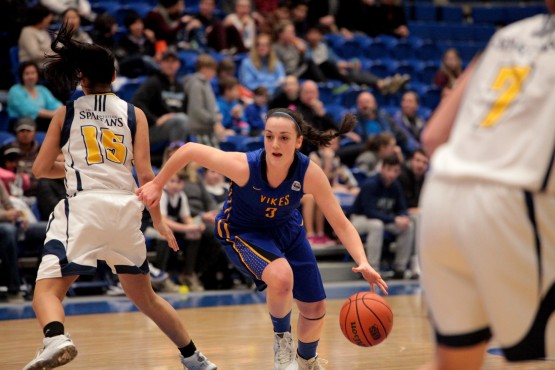 Their resolve was on full display in the Vikes’s two final regular season games against the UBC T-Birds. On Thursday night, the Vikes found themselves down by a point with just 17 seconds left in a hard-fought game. Kristy Gallagher took the ball off the inbound, shouldered her way past UBC’s Madison Legault and Maddison Penn, and went for the lay-up — only to see it bounce off the rim.