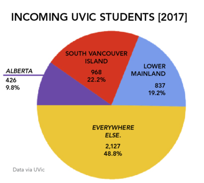 Roughly 4 358 students registered at UVic in 2017. According to student recruitment data from that same year, roughly 950 of those students came from South Vancouver Island, 830 came from the Lower Mainland, and about 400 came from Alberta.
