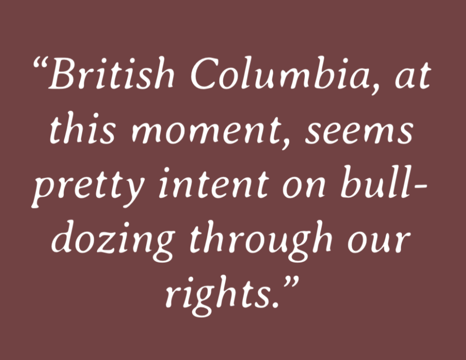 “You look at this most recent British Columbia Supreme Court decision, and they seem to completely ignore that history. They completely ignored that discussion regarding rights and title that we won in the previous case … British Columbia, at this moment, seems pretty intent on bulldozing through our rights,” he says.