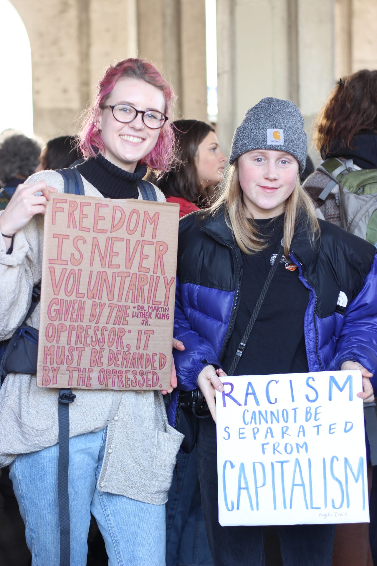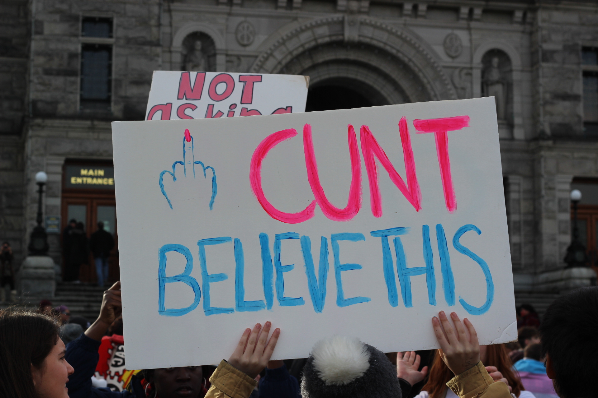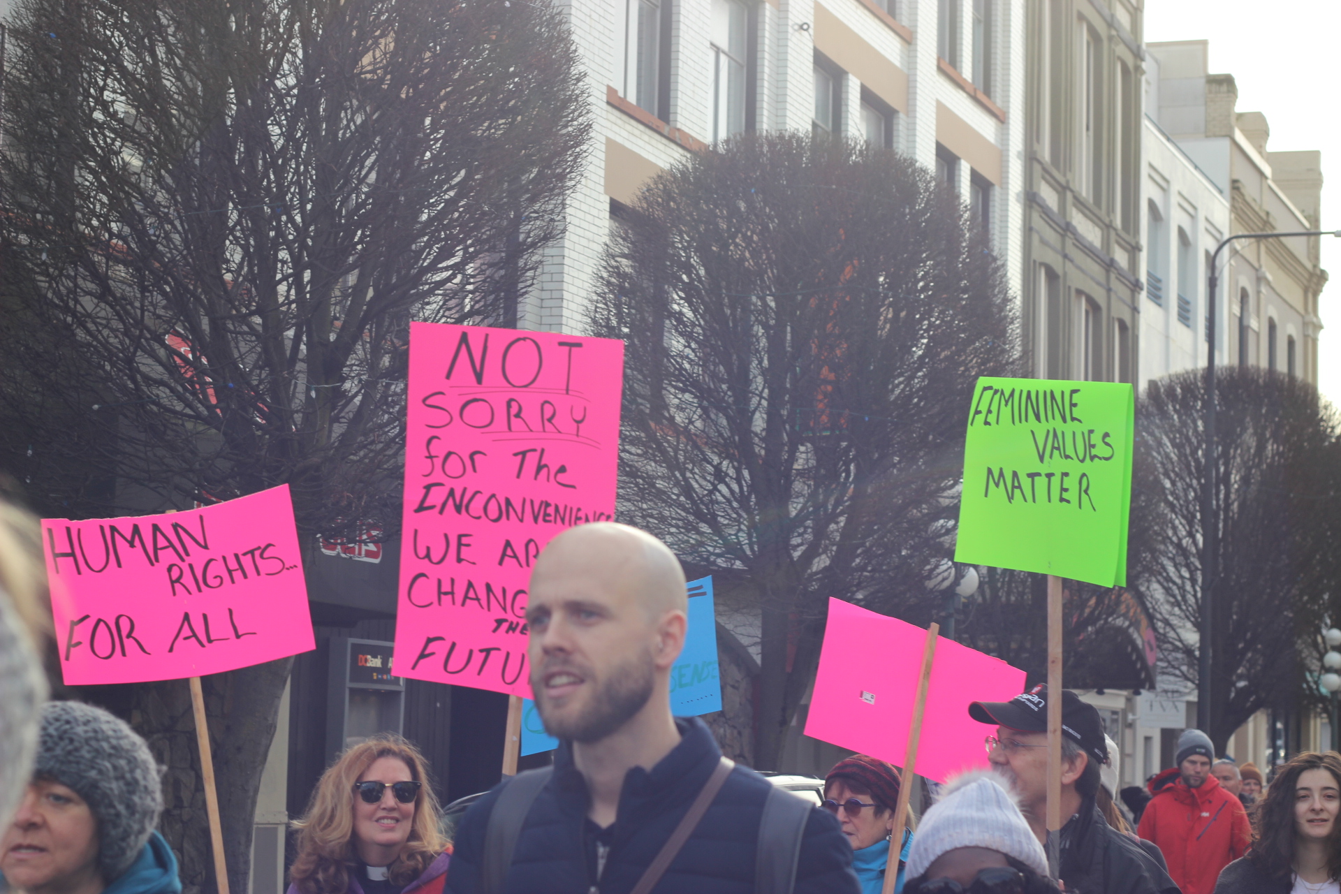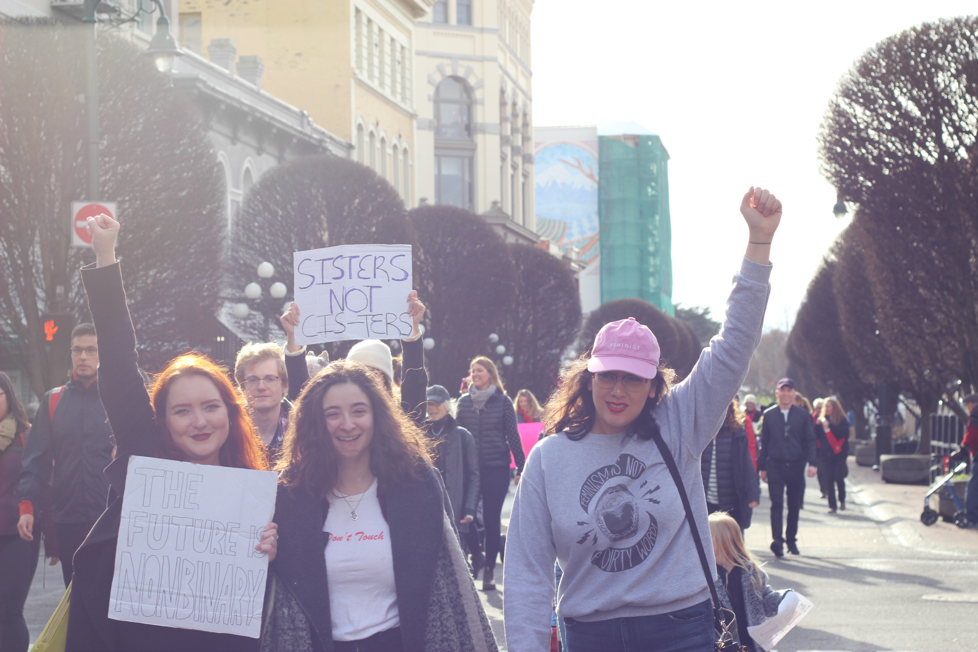 Although pink hats with ears, called ‘pussy hats’, became a symbol of feminist unity following the 2017 Women’s March on Washington, these could only occasionally be seen bobbing among the crowd this year. Women’s March Victoria released an official statement calling pussy hats “transphobic” because “Not every woman has a vagina, and not every person who has a vagina is a woman. In addition, not every pussy is pink.”