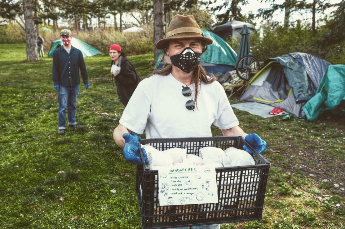 With vital donation chains severed in the face of the pandemic, Graeme was finding even more food thrown out. With the help of his roommates, Graeme was able to give away two crates of hand-made sandwiches made with ingredients diverted from the waste stream to Topaz Park residents, which in recent days has become a designated shelter area for the street community in Victoria. The houseless community are among those most hard hit by the pandemic.